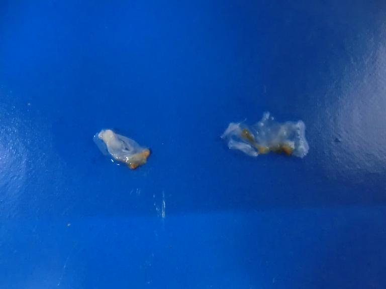 これが剥がした袋の断片です。今回はいくつかにちぎれてしましました。