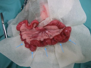 開腹してみると、腸管が真っ赤に炎症を起こし引きつれているのが確認できます。